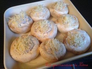 Déposer vos chapeaux dans un plat allant au four puis les farcir avec la préparation, saupoudrer de gruyère râpé.