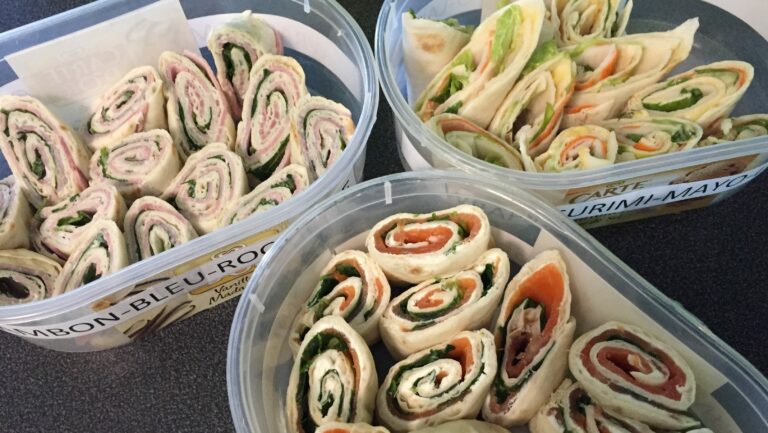 Je cous conseille de réaliser les wraps à l’avance et de les conserver roulés dans du film plastique au réfrigérateur. Ils se tiendront encore mieux lors de la coupe.